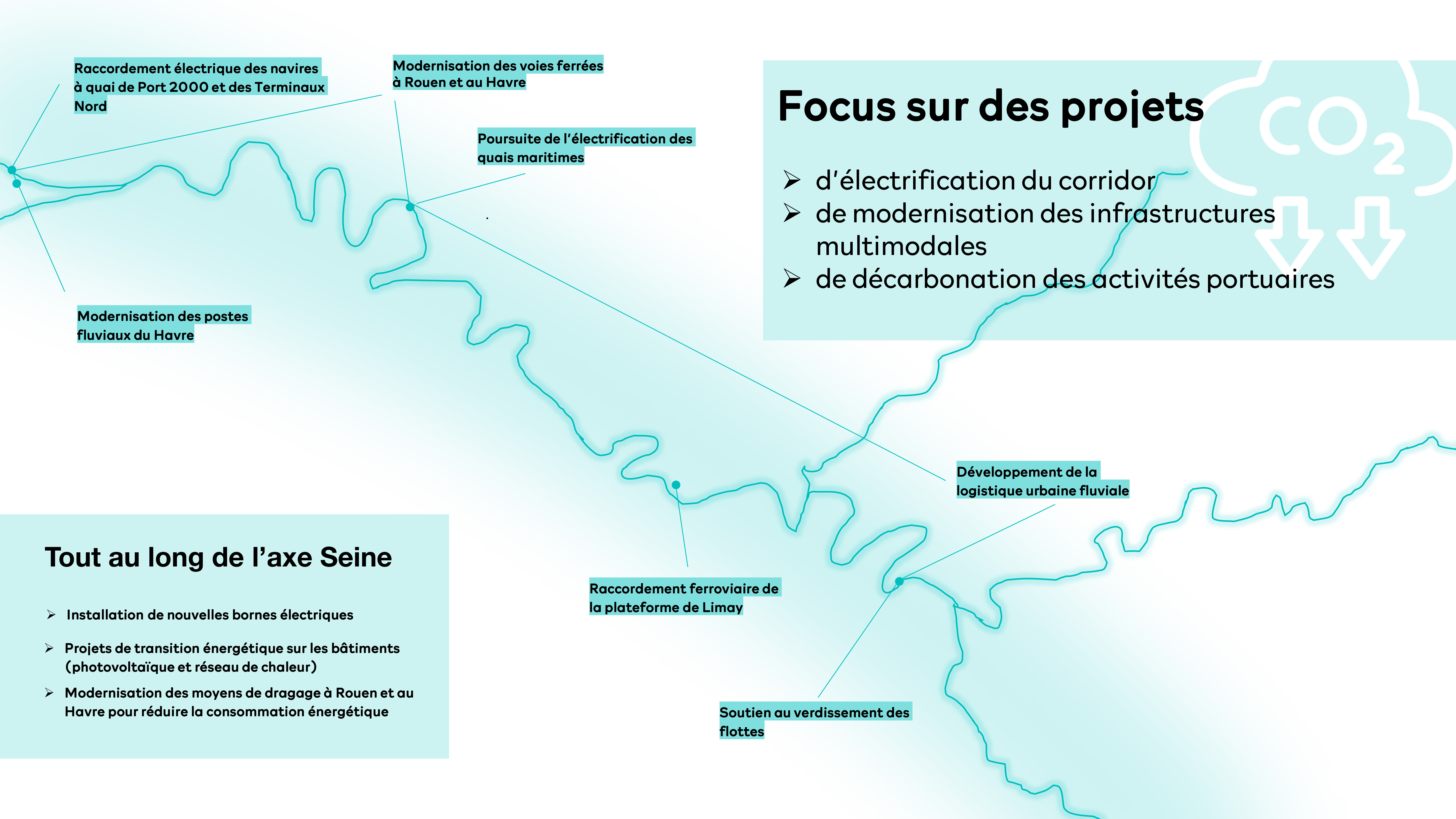 Enjeu majeur de la stratégie 2026-2030, la décarbonation de l’axe Seine passe par une politique volontariste d’intégration de tous les outils et moyens nécessaires à cette transition. Raccordements ferroviaires, électrification des quais et des terminaux, facilitation du dernier kilomètre et finalisation de la chatière au Havre visent à concrétiser une trajectoire « zéro émission » à 2050 et contribuer ainsi à la décarbonation de l’économie nationale.